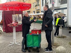 Bei kalten Temperaturen trotzdem vor Ort: Bei guten Gesprächen mit der mobilen Sprechstunde am Rande des Wochenmarktes am Arnswalder Platz.